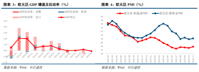 欧洲经济持续降温。欧洲经济三季度落入负增长区间,融资条件收紧的影响不断扩大,劳动力市场走弱,新增就业岗位减少。随着能源危机消退,各国政府于2023年四季度逐渐退出财政支持措施,财政压力略有改善的同时,经济也将进一步承压。