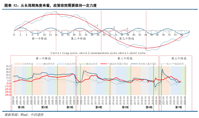 三季度经济修复,四季度政策发力,库存周期切换至被动去库存。10月经济出现波动,PMI回落,工增价格平稳,修复节奏出现放缓。10月底,人大常委会调整2023年年度赤字率,新增一万亿国债释放刺激信号。10月工业产成品库存增速回落至2.0%,收入增速转正,周期进入低点与10月数据呼应。后续从数据趋势以及政策预期来看,库存周期进入上行阶段,当年至明年年初库存数据大概率低位震荡,收入等其他指标逐步改善。宽财政延续,2024年上半年有望进入主动补库存。随着一万亿国债发行落地、2024年国债提前批发行、2024年两会宽财政政策持续,中性预期,库存周期将在2023年3月至4月进入主动补库存阶段。从长周期角度来看,潜在经济增速下行,库存周期高度受到制约,因此需要一定力度的政策对冲,才能保持高度。在2024年政策发力的情况下,库存周期上行的高度好于之前的预期。