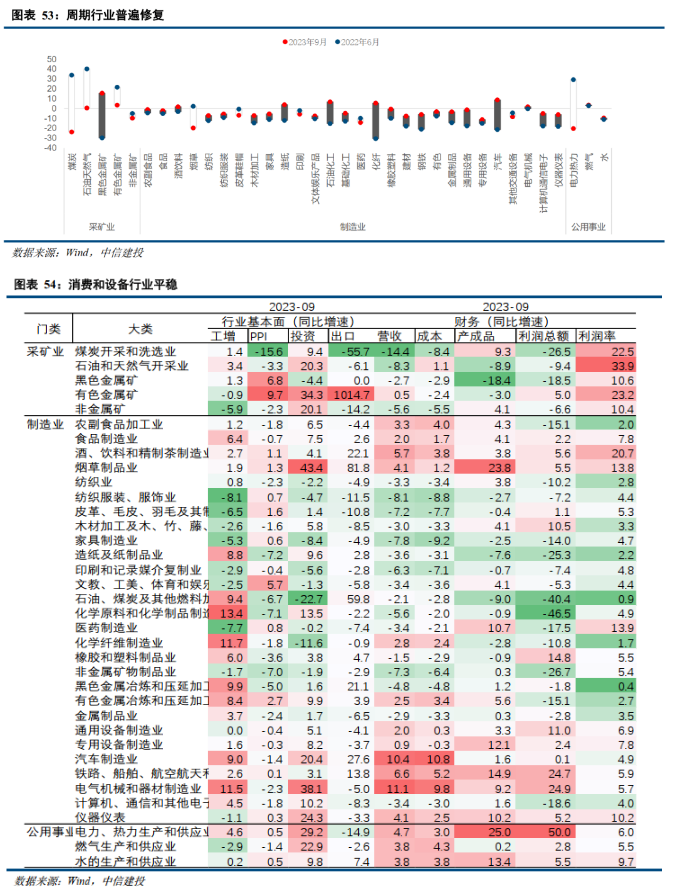 从库存周期角度来看,短期内周期行业普遍修复,但周期内部行业分化。当前进入被动去库存阶段,从历史经验来看,整个周期上行阶段,周期行业修复幅度未来高于其他行业。但目前周期行业受到地产下行的压制,后续需要关注两个方面:(1)主动补库存高度的预期,需要等到明年两会来判断;(2)周期行业自身产能的限制。从产能角度俩看,重点关注上游采矿业。从中长期来看,产业升级和内需是经济增长的重要动力,重点关注战略新兴行业和消费行业。近年,现代产业体系建设重要性日益凸显,十九大报告、十九届五中全会公报、十四五规划、二十大报告等一系列重大政策文件中多次针对现代化产业体系做出重要论述。2023年5月二十届中央财经委员会第一次会议继续研究加快建设现代化产业体系等问题,并明确现代化产业体系是现代化国家的物质技术基础。现代化产业体系具有智能化、绿色化、融合化三个基本特征。战略新兴行业是现代化产业体系建设的重要领域,具有长期价值。另一方面,在外部环境压力日增情况下,内需尤其是居民消费对经济贡献不断提升。经历了整年的经济修复,居民消费的“疤痕效应”减弱,消费进一步改善。