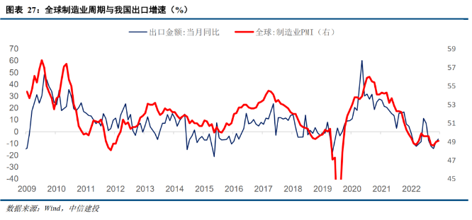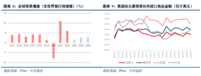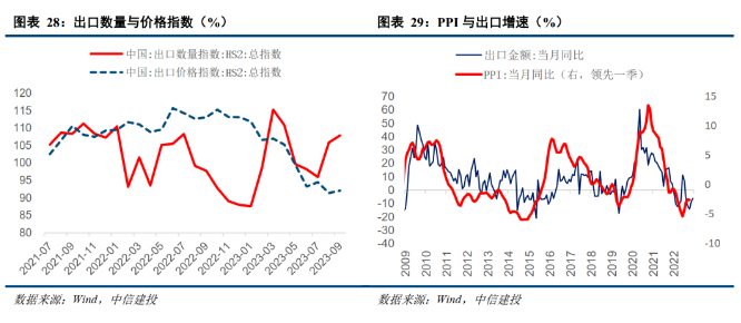 价格周期回暖,也将拉动出口增速改善。商品价格增速与我国出口增速高度相关,大致领先一个季度左右。首先,贸易增速为名义增速,出口商品价格的变动对出口增速也有影响。其次,商品价格的上涨有助于资源出口型国家提高进口能力,进而扩大全球贸易以及对中国商品的进口需求。最后,商品价格上涨有助于改善预期,增强企业生产投资意愿或者家庭消费意愿,最终扩大贸易规模。2023年价格周期下行拖累我国出口表现较多,反而出口数量指数下行有限,2024年价格周期总体回暖,有利于提振出口增速。