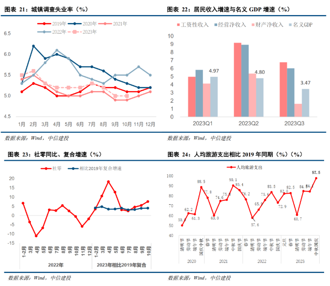 居民部门就业经营改善,疤痕效应渐弱,消费有望继续修复。二、三季度以来,随着疫情影响大幅减弱,居民部门就业持续改善,9月和10月城镇调查失业率回落至5%,已低于2019年同期水平,二、三季度居民人均可支配收入增长快于名义GDP,说明居民部门修复快于政府、企业,尤其是工资性收入、经营性收入实现较高增长,疫后工薪阶层、个体户等现金流量表改善明显。以居民消费支出占可支配收入比例衡量的消费倾向指标也达到近年同期最高水平。考虑到当前消费增速与常态化水平仍有差距,从重要节假日人均消费支出看,也仍未达到2019年同期水平,因此未来居民就业、收入和信心的持续改善,现金流量表持续修复,疤痕效应逐步减弱,消费动能有望继续向常态化水平靠拢,预计社零增速达到6.4%左右。