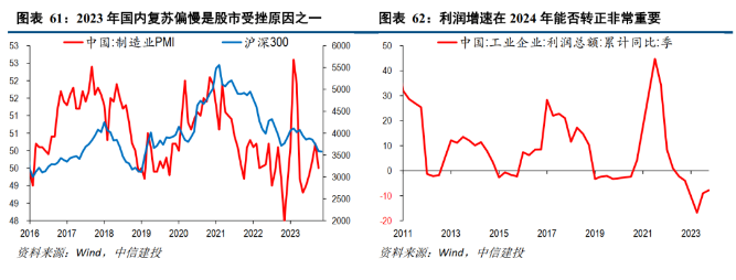 海外流动性紧缩、国内复苏偏慢,共同压制A股在2023年的表现。第一,全球流动性紧缩,美联储大幅加息缩表。美国经济强势和通胀韧性超出市场预期,美联储连续加息4次,上调目标利率100BP。10年期美国国债收益率从4月初3.3%一路上冲,10月下旬一度突破5%。全球流动性紧缩对全球风险资产造成负面冲击,推动外资流出,也在今年5-8月带来人民币汇率巨大的贬值压力,限制了国内货币政策空间。第二,国内经济复苏偏缓,企业盈利受拖累。4月以来,PMI等指标低于季节平均水平,通胀、社零、投资数据均未能尽快回到正常水平,A股企业盈利预测则出现了明显下修,目前预计全年业绩增速为-5%~0%。分子端向下背景下,即使市场下跌也并未跌至估值最低位置。第三,增量资金不足。今年以来A股增量资金流入明显不足,权益基金发行近1800亿,8月中旬以来外资持续大规模流出,全年净流入仅550亿。股权融资和股东减持两个方向的资金流出较高。2024年A股面临的环境边际改善,可以更加乐观。从盈利层面看,今年A股盈利总体偏弱,多个季度负增长,明年A股盈利有望实现正增长,基本面好于今年。从估值层面看,中性假设下明年无风险利率持稳,风险偏好小幅提升,因此估值也基本平稳或小幅提升。从政策层面看,地方债务和房地产市场风险化解持续,政策工具箱的空间也非常丰富,有利于提振投资者信心。从中美关系看,乐观预期下美国在大选前会推动中美关系进入稳定或是边际缓和状态,对市场情绪、外资流动等方面形成有利支撑。从美联储货币政策看,紧缩态势在明年将有边际缓和,甚至进入降息周期,有利于人民币汇率和A股的表现。综合来看,明年市场大概率好于今年,实现小幅的正收益,在活跃资本市场政策的推动下,上涨幅度也可能超出基准预期。
