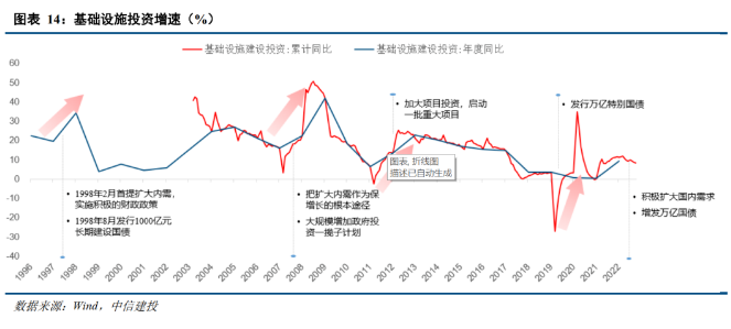 政府主动保增长诉求上升,基建作为关键抓手,预计投资增速将回升。1998年,亚洲金融危机对我国经济发展造成较大冲击,我国提出“立足扩大国内需求,加强基础设施建设”,实施积极的财政政策,发行长期建设国债,稳定了经济增长。2008年、2020年针对国际金融危机、新冠疫情的冲击,我国坚持实施扩大内需战略,基建投资也相应加快,促进了经济稳定。2023年7月24日,政治局会议强调积极扩大国内需求,10月20日,全国人民代表大会常务委员会批准增发一万亿国债,用于防洪治理工程等八大方面,加强基础设施建设的特点突出,国债项目申报将于11月中旬结束,预计将推动2024年基建投资实物工作量的增长,基建投资增速有望上行至8.7%左右。