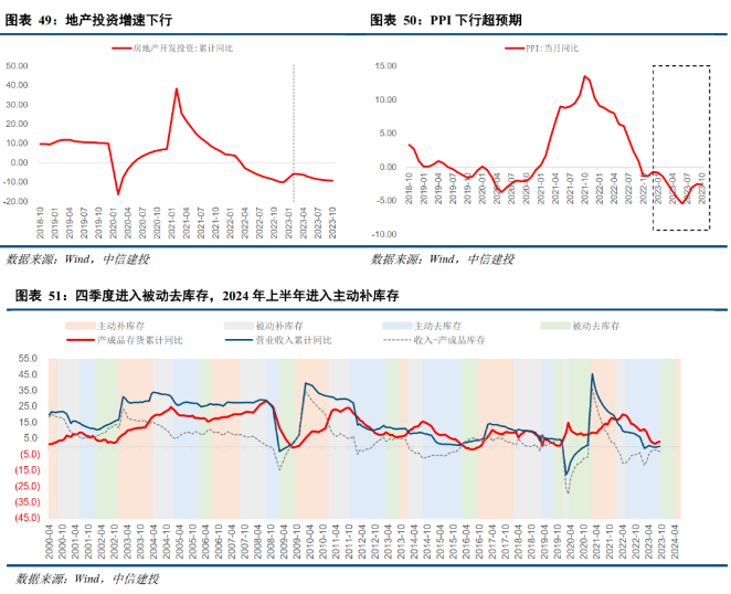 综上所述,扩需求、防风险,都要求货币政策提供较为宽松的流动性环境和适宜稳定的融资利率,央行不存在长期收紧流动性的动机。外部制约方面,在美联储加息周期的末期,我国央行的货币政策操作空间逐步加大,明年货币政策受外部环境制约减弱,更为关注国内经济增长和金融业供给侧结构性改革。预计2024年还将继续降准降息,幅度可能与2023年类似,即降准50BP,降息20BP左右,并带动存款利率调降。2023年经济温和修复,主动去库存延长2个季度。2023年二季度开始,地产下行压力增加;4月房地产投资增速下行至 -6.2%,之后房地产累计投资增速逐月下行,10月房地产投资增速下行至 -9.3%。地产产业链承压,拖累经济复苏。同时PPI回落,使得名义值修复放缓。库存周期拐点由5月延后至10月份。
