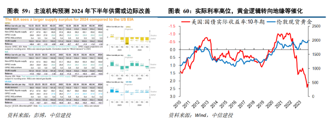 原油供需在短期仍有恶化可能,明年若非美经济体逐步修复,压力或逐步减轻。原油的基本面矛盾在过去两年主要集中在供应端,随着美国产能无法释放,俄乌冲突放大俄罗斯产能的边际影响,OPEC+在定价端的话语权重新增加,沙特主导的减产成功对原油价格形成较强的支撑,在全球需求尚未恢复到疫情前的背景下,持续高于页岩油的成本中枢。今年三季度以来,原油价格开始大幅震荡并一度下跌,和OPEC+内部成员的减产意愿出现分化有关。短期来看,在油价出现一波回调和冬季需求清单的背景下,减产协议的维系可能仍会有一定阻力和波折,不排除油价出现震荡走低。但随着中国、欧洲等需求的逐步回暖,以及OPEC+成员国在财政压力下无法容忍油价持续下行,后续联合减产依然是最优解,叠加年中前后潜在的降息窗口,油价或再度爬升。黄金传统逻辑生变,地缘、去美元化、降息或催化短期交易机会。类似美债,黄金在加息周期的尾声,同样获得市场高度的关注。过去两年,在联储快速加息、实际利率大幅攀升、美元冲高、通胀回落的不利环境中,金价相对坚挺,并未出现系统性的下行。尤其是实际利率这一最传统的解释变量,近两年失效严重。我们判断,在尽管金价没有下跌,但如果实际利率继续保持高位、无法趋势性下行,金价创新高的难度依然存在。因此,短期黄金的机会可能来自于其他一些逻辑的演绎,例如地缘冲突带来的避险需求、去美元化的讨论阶段性升温、以及年中潜在的联储降息,都可能带来金价的短期上行。