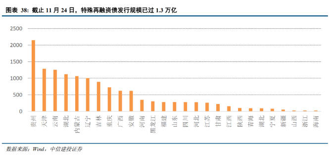 从防风险的角度考虑,预计财政会就一揽子化债方案的实施策略和中长期规划给出较为明确的指示。今年10月到11月24日,已有28个省区市累计公告发行特殊再融资债券1.37万亿元,且本轮隐债化解呈现出发行总量大、发行期限长(5-10年期限债券占比80%以上)、区域性明显的特征。未来几年发更多的债、利息更低的债已经成为共识,但化债并非财政一家之事,特殊再融资债只能解燃眉之急。一方面,隐债余额减少至零并非终点,隐债减少的同时,经营性债务增速和余额大幅上行,后续的全口径债务管控难度仍较大。另一方面,隐债显性化必然带来当地债务率的上行,部分地方政府可能会面临信贷受限、再融资能力不足、项目规划能力削弱、投资能力下降的局面。2023年金融街论坛年会上,潘功胜行长表示必要时央行将对债务负担相对较重的地区提供紧急流动性支持,预计后续化债工作将由各个部门打出组合拳,财政发债、央行提供流动性工具、银行展期降息等均会配套执行。