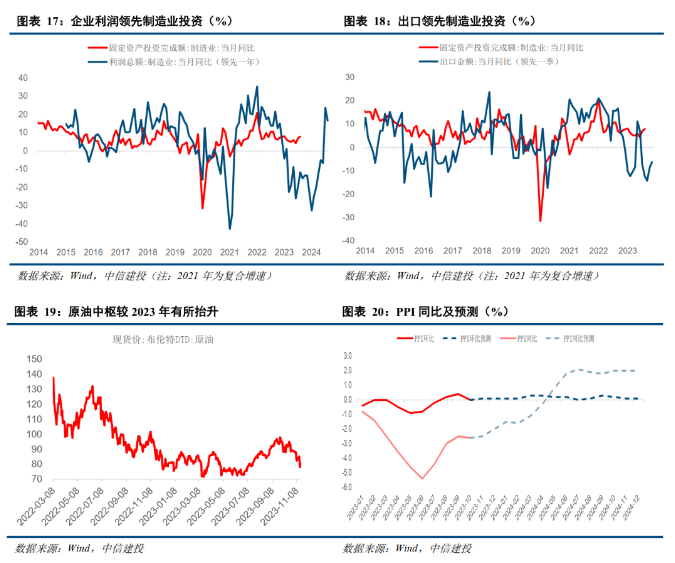 企业利润增速转正,基本面改善有望驱动制造业投资回升。2022年以来国内外经济走弱,叠加物价走低,制造业企业利润持续萎缩,连续五个季度负增长。2023年8月以来,随着需求边际好转,价格回暖,制造业企业利润当月同比增速转正。从历史数据规律看,企业利润领先投资约一年,今年三季度以来制造业利润周期好转,虽有波折但已结束低迷周期,未来一方面投资、消费、出口等需求回暖,另一方面PPI改善,考虑2023年的低基数以及2024年的经济修复,PPI同比将由负转正,预计2024年年前有望在0.8%左右。量、价上行将带动制造业企业利润进一步回暖,有望引领2024年制造业投资的回升至8.2%左右。出口筑底改善,外需回暖有望驱动制造业投资回升。我国仍是世界工厂和制造出口大国,出口形势对企业投资有明显影响,从历史数据规律看,出口领先投资约一季度,三季度以来我国出口增速降幅大幅收窄,预计四季度及2024年出口形势总体改善(见下文),也将带动2024年制造业投资的回升。