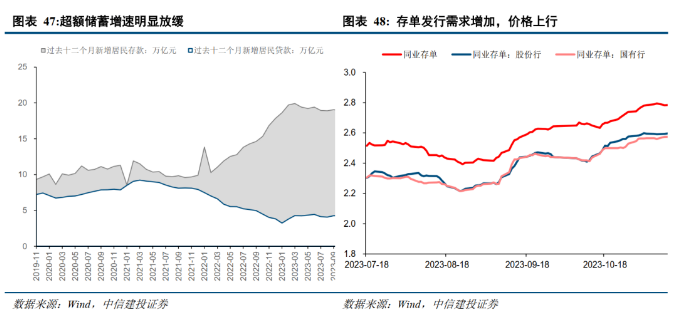 第五,超额储蓄增速收敛,资金面极度宽松的局面终结,部分发债高峰时点银行同业负债压力上升。自疫情以来,我国居民储蓄存款快速积累,2022年居民存款增量和增速明显超过往年季节性,按照滚动的过去一年新增居民存款数量定义新增居民存款进行研究,2022年居民新增存款17.84万亿。但2023年下半年以来,随着经济和消费需求的恢复,以及存款利率的调降,超额储蓄的增速见顶回落。叠加下半年的债务发行高峰,银行反而出现了同业负债紧张的局面。展望2024年,存款特别是定期存款利率较高背景下,银行揽储的意愿不高,超额储蓄增速料继续回落,对资金面的长期支持减弱,可能造成资金面的波动增大,同业存单发行压力上升。