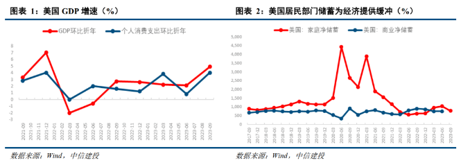 联储加息结束,高利率立场下仍有降息空间。联储本轮快速和大幅加息,是造成目前美债利率和美元指数大幅走高并长期维持的宏观背景;随着通胀的回落和紧缩滞后效应的显现,联储有望结束本轮加息周期、并与2024年开启降息周期。联储一再强调将通胀控制到2%的最终目标,联邦基金利率将在较长时间内处于紧缩位置。在不发生衰退的前提下,预计快速和大幅降息不会出现。但随着去通胀进展顺利,经济边际上仍有滞后风险,联储依旧会进行操作上的平衡。预计不会再有新一次加息,且在通胀不大幅反弹基础上,2024年降息2-3次。美国经济不衰退依然是基准假设。2023年初,市场对于美国衰退的预期非常强烈,但实际表现非常亮眼,前三季度GDP环比折年率均超过2%,三季度甚至高达4.9%。在联储加息、硅谷银行危机等负面压制下,美国居民部门在财政帮助下未受到太大冲击,或是经济韧性的主要原因。展望2024年,货币政策的逆转或是利率和美元边际拐点的重要催化剂,随着多项指标的边际好转,美国仍有很大概率延迟或避免本轮衰退。美债利率见顶,美元或有回落空间,人民币贬值压力缓解。从历史走势来看,在加息周期内,10Y美债收益率通常在触及政策利率高点后逐渐回落。随着联储加息结束,本轮美债利率上行有望见顶,从而推动美元走软。对人民币而言,贬值的外部压力缓解,中美利差或有收敛,资金流入环境边际改善。