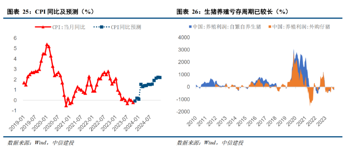 居民消费的回暖也将带动CPI回升,预计2024年CPI同比中枢在1.6%左右。一是PPI上行带动成本回升;二居民消费需求继续向均衡水平贴近,供需格局改善;三是低基数影响,尤其是2023年2月春节错位导致基数大幅走低,相应地2024年2月CPI同比也将跃升。此外,2023年以来猪价持续低迷,生猪养殖连续亏损,能繁母猪开始去化但截至当前幅度不大,如未来去化加快,2024年猪价上涨或超预期,带动CPI可能超出基准预期。