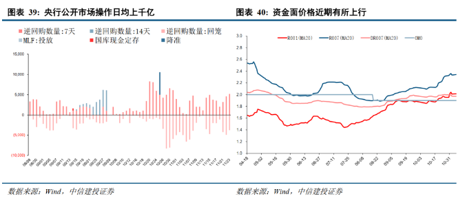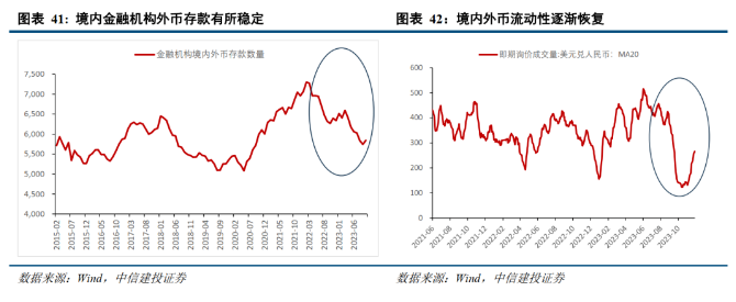 第一,财政接棒稳增长的背景下,资金面需合理充裕以做好配合。下半年以来,财政政策在债务发行和支出节奏方面持续发力,对冲经济增速下行压力。其中,四季度赤字率提高至3.8%并增发1万亿国债,而特殊再融资债也增发超过1.5万亿,在此背景下,财政政策对明年上半年基建和经济增速的托底作用明显增强。而货币端由于净息差大幅收窄、海外紧缩造成的流动性压力仍存,而难以大幅降息降准支持经济增长。近期金融工作会议和央行三季度货币政策执行报告更为注重熨平经济波动的“跨周期调节”,说明短期宽松操作的动机有所下降。第二,从2024年全年来看,中美利差收窄和外资流出放缓有持续性,对货币政策的制约减弱。11月以来,中国经济企稳,而美国通胀和就业走势有所走弱,人民币汇率企稳,中美利差亦有所收窄。金融机构的境内外币存款数量、代客结售汇顺差都出现低位企稳迹象,而银行间市场的外汇交易流动性亦有所恢复。展望2024年,海外压力料较2023年有所好转,通过流动性渠道和外资渠道对国内货币政策的压力料将减弱。但也需要注意2024年年中美国降息预期能否兑现,以及美国大选对于政治经济关系的影响会否对外资信心产生新的波动。