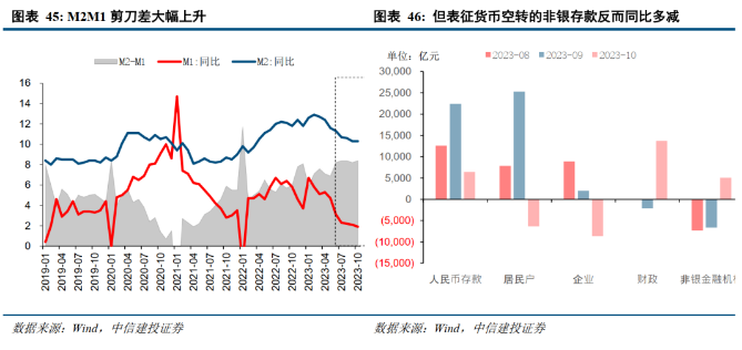 第四,“货币空转”对于稳健货币政策的制约不强。23年全年,M1增速由年初的6.7%下降到10月的1.9%,M2与M1剪刀差全年亦持续下滑,中央提出货币空转问题引起市场高度关注。我们认为,本轮“货币空转”的成因与2019年及之前的状况存在明显不同。本轮M2与M1剪刀差扩大,但非银存款未见明显上升,显示金融体系内加杠杆并非导致本轮空转的主要原因。观察存款分项的走势可以发现,企业需求和资金活化不足是导致M1走低的主要原因。此外,也要注意本轮M1增速大幅下滑发生在连续两轮存款利率调降和高息存款产品压降之后,猜测部分企业活期存款可能正定期化,或是逐步被货币基金等其他流动性产品所替代。最后,进入下半年,融资端主要依赖政府债务支撑,地方债、再融资债、国债和增发国债相继密集登场,在此背景下政府成为主要的融资方,而密集发行的政府债传导到企业收入还需要时间。基于以上三点原因,再考虑到M1并非央行主要的政策目标,面对货币空转的问题,央行的主要任务或是提高资金使用效率、盘活存量资金而非简单的紧缩来压降同业杠杆。