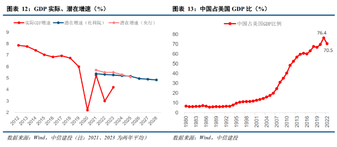 国内多年存产出缺口,金融风险总体水平被动上升,需要经济较高增长化解。疫情三年GDP缺口本已较大,叠加2023年疫后修复不及预期,我国GDP连续四年低于潜在水平,巨大产出缺口导致宏观杠杆率被动上升,势必推高金融风险总体水平,地方政府债务、中小金融机构、房地产等领域矛盾暴露突出,保基本民生、保工资、保运转压力加大,冲击着不发生系统性风险的底线。发展仍是解决我国一切问题的基础和关键,保持量的合理增长的重要性、迫切性明显上升。中国GDP占美国比值回落,需要经济较高增长塑造更有利国际环境。2022年,我国GDP占美比例由76.4%回落至70.5%,2023年我国疫后修复偏慢,而美国经济韧性超预期,叠加人民币贬值,致使我国经济总量占美比例进一步下降。从大国竞争的角度看,我国需制定合理较高的经济增长目标,保持“东升西降”大趋势,一方面可提高自身的竞争实力与底气,另一方面一个具有较强成长性的中国大市场持续向世界释放增长红利,无疑会形成强大的吸引力,有利于拓展在投资、贸易、技术等领域的国际合作空间,塑造国际竞合优势。内外形势演变之下,预计2024年经济增长目标制定在5%左右的较高水平。在国内经济运行偏弱、大国竞争格局阶段性演变、市场预期不稳的关键节点,要改善社会心理预期、提振发展信心,客观上需要从制定较高的经济增长目标入手,如政府继续下调预期增速,则易引导预期进一步转弱。实际上,政府稳增长的诉求也确实开始提升,从人大常委会批准增发万亿国债兴修水利,到中央金融工作会议提出加快“三大工程”建设,要求一视同仁满足不同所有制房地产企业合理融资需求,预计重量级稳增长政策会越来越多,保障2024年实现5%左右增速。
