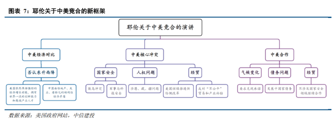 中美关系短期边际向好,中长期博弈态势未改。下半年中美关系边际向好,双方均充分展现缓和意愿。美国官员密集访华释放缓和信号,习近平总书记在APEC峰会期间与美总统拜登会晤,显示出双边关系在外交层面显示出较大缓和意愿。但在微观层面,双方在经贸和投资领域仍时有摩擦,特别是在对华企业制裁方面仍未见实质改善。中期来看,中美关系的发展仍取决于能否在双方底线问题上达成共识,但全方位竞争格局难以发生逆转。今年4月20日,耶伦在约翰·霍普金斯大学演讲,主张建立中美竞合新框架。在中美冲突部分,耶伦主要关切国家安全、人权问题和经贸产业领域。在中美合作部分,耶伦提及气候变化、发展中国家债务问题和中美贸易基本盘的稳定。