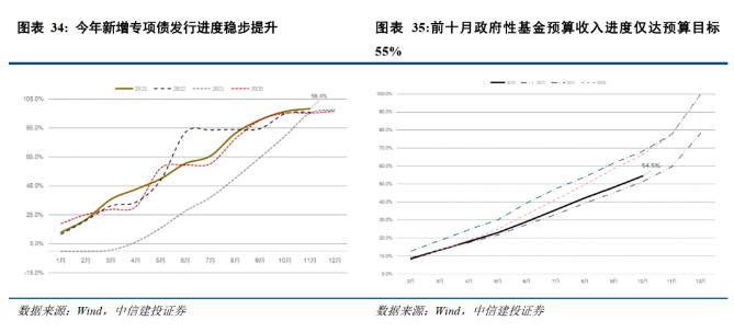 年底之前,财政政策亮点不断,特殊再融资债券的大规模发行平抑了区域信用风险,赤字调整至3.8%大超预期,为明年留足政策空间。3%的赤字率约束打破是审时度势之后的政策动态调整,自2020年疫情爆发之后, “赤字率压制下的中央赤字+不断膨胀的政府性基金”成为债务膨胀的主要特征,但在地产投资不振的背景下,国有土地出让收入锐减,今年前三季度的政府性基金收入仅达到年度预算的48.1%,政府性基金账本的自平衡越发困难。因此,从长期债务化解和央地债务一盘棋的角度出发,中央主动承担一定的加杠杆责任是有必要的,2023年的年中调整为24年财政政策制定拓宽了空间,解放了思路。