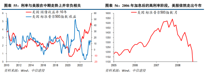 2024年,海外和国内都在逐步正常化:欧美去通胀有望避免衰退,加息周期结束;国内经济继续复苏有望再通胀,货币政策宽松护航。相较于2023年的海外紧缩、国内类“通缩”的组合,2024年的宏观环境存在明显边际改善。无论海外还是国内,风险资产在流动性和基本面方面都有支撑,相对更有优势。考虑到海外加息周期的结束和国内经济增速中枢长期下移的压力,债券资产的配置机会彰显,但交易性机会可能仍需要等待。商品内部分化,供需博弈、地缘博弈等干扰较大。高利率并非一定会压制美股,基本面潜在改善空间提供盈利端的支撑。联储加息周期结束基本成为一致预期,但同时宣称要保持高利率较长时间,因此市场对于降息的期待不敢太高。那么,加息结束与降息难启这两个事件,哪一个对于美股关键呢?市场普遍担忧,利率高企对于美股估值压制较大,此外,债券相对股票的性价比也处在历史高点,或减少对股票的投资需求。我们认为,估值的压制肯定存在,但只要加息结束,这部分冲击的影响高峰可能过去,短期美股的主要矛盾可能在于盈利端。高利率能够维持,一大背景来自美国经济和通胀的韧性,这意味着盈利端不会出现很大恶化甚至有边际改善的空间,这对于美股构成支撑。实际上,历史经验来看,美债利率与美股的关系并非简单的负相关,多数时候反而呈现同向走势。此前类似的高利率历史环境,美股也曾收获可观的涨幅。针对联储所宣称的higher for longer,比较类似的一段历史可能是2006-2007年,当时联储同样快速加息到5.25-5.5%的高位,随后虽然结束加息,但长达5个季未开始降息,直至后续次贷危机爆发。这段时间中,美股涨势喜人,标普500一度涨幅超过30%。因此,只要美国不出现重大危机,单纯高利率未必会成为美股进入熊市。