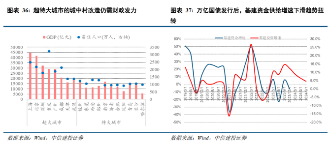 从稳增长的角度出发,经济复苏的动能尚未稳固之前,财政稳增长的举措就不会退场。我们预计2024年开年财政政策组合可能以“3.5%左右赤字率 + 3.8万亿以上新增专项债”的形式出现,其主要原因在于明年经济增长的动能仍需要财政逆周期调节进行提振。由于2023年年末进行了预算赤字调整,新增一万亿国债发行预计会在2024年全年形成大批实物工作量,可以阶段性对冲基建投资增速中枢下滑的趋势,但要维持基建投资增速的稳定,2024年财政方面仍需要有不低于今年的基建资金供给。同时,包括城中村改造、保障房建设和平急两用项目在内的“三大工程”建设也是拉动区域房地产投资和基建投资的重要抓手,急需财政内资金和货币财政组合资金的增量供给。总之,考虑到隐债化解、三大工程、基建逆周期发力等因素,2024年财政政策的稳增长压力并不轻,整体基调宜宽不宜紧。